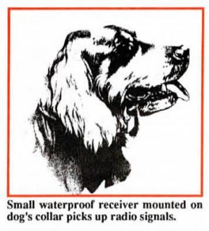 The transmitter. sends a radio signal through the buried wire which circles the yard or farmstead area. When the dog comes within a preset distance of the wire (from about 5 to 15 feet) the receiver attached to his collar picks up the radio signal and emits a high pitched beeping noise which warns the dog to step back. If he doesn't move back within a couple seconds, he receives a small shock ù not enough to hurt but enough to get his attention. The dog continues to get this slight shock until it backs away from the underground fence.