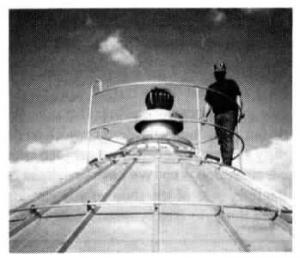 Our new safety rail for grain bin roofs provides a sturdy handrail when you're opening or closing a bin. One size fits all bins. The two semi-circular pieces create a rail about 8 ft. in dia. Simple mounting brackets and drill screws are provided for easy installation. A 2-screw hold-down strap screws into each rib on the roof. The rail, which sells for $112, is made from 1-in. dia. galvanized tubing. One pair of rails weighs just 40 lbs. (Vince Steffen, Harvestall, 3 North Walnut Ave., New Hampton, Iowa 50659 ph 800 722-7544)