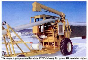 The auger is gas-powered by a late 1970's Massey Ferguson 410 combine engine. The combine was stripped down to its final drives, cab, and engine. The frame was stretched from 10 to 15 ft. behind the cab.