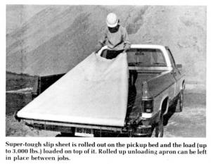 A super tough slip-sheet is unrolled and laid out on the floor of the bed. Then, whatever is to be hauled is loaded onto the truck on top of the slip-sheet. To unload, the slip-sheet is wound up on the roller, and the load slides gently to the tailgate and off. It will dump part of a load and it will spread. The tailgate may be either up or down for loading.