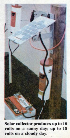 Maximum output of the solar energizer is 19 volts (150 miliamps). Even on a cloudy day, it will produce about 15 volts of battery-recharging current, explains Henderson. "You can string up to 10 miles of solar fence using our MK4 controller, a regular 12 volt car battery, and the new solar energizer to keep the battery charged."