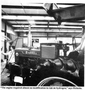 Hydrogen is produced by running an electrical current through water. It splits the water molecules into their two components, hydrogen and oxygen. On Rickett's Far-mall, a solar panel supplies the electricity, which passes through water in the fuel tank. The oxygen generated by the system is ejected while the hydrogen is pumped to a normal welding tank mounted on the side of the engine and fitted with a special low pressure regulator. It plumbs into the regular fuel line that feeds the engine where the hydrogen burns just like the propane that originally powered the tractor. Other than changing plug gaps, the only other change Rickett made was to engine timing. "The tractor runs beautifully. We didn't modify the engine itself at all."