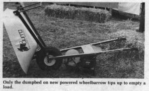 It's possible with the new motorized "Wheelburro" from HP Development Co., Salt Lake City, Utah. Stan Walsh, sales representative, points out that the Wheelburro's uses include landscaping and masonry, as well as cleaning barns and hauling feed. With its engine power, it can handle jobs that are too much for a regular wheelbarrow but not large enough for a tractor.
