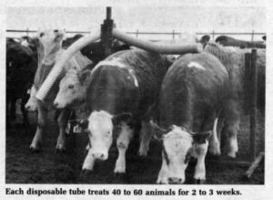 Dust (1% Coral) comes in disposable tubes which you throw away when empty. The tubes (4 1/2 in. in dia. and 44 in. long) sell for $19.95 each. One tube treats approximately 40 to 60 animals for two to three weeks, which figures out to only about 2 cents per head per day to keep dairy or beef cows free of flies and lice, says Roger Swihart, distributor.