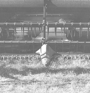 "It works on the principle that the more evenly you feed the combine, the more efficient it will be in threshing the crop," says Richard. "The problem on a conventional auger header is that grain coming into the center of the header gets blocked by the grain that's coming in from either side, creating big bunches. The bunches don't thresh well which can result in in-creased grain loss and uneven windrows. The heavier the crop, the worse the problem is. The flow divider diverts the crop away from the center of the header so that it can join the supply coming from either side and provide a steady flow to the feederhouse.