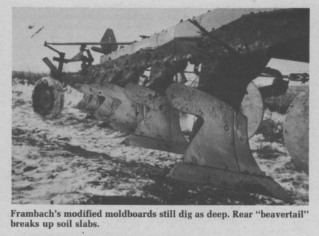 "I've sold 160 sets of these new cut-off plow bottoms within 10 to 15 miles of my home and I've never had a set returned yet," says Jim Frambach, farmer-inventor of a new cut-off moldboard plow that busts up soil as it turns it, eliminating soil "slabs" and leaving 30 to 50% of residue on the surface.