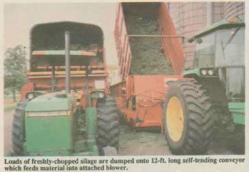 Loads of freshly-chopped silage are dumped onto the self tending conveyer which feeds material into the attached blower. Until now, silo-filling conveyors and blowers have been separate units. Anco Mfg. has combined them into one machine.