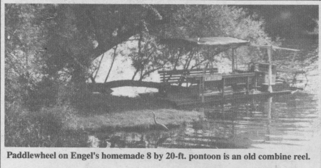 What farmers notice when they get close up is that the paddlewheel of Engel's homemade pontoon is an old combine reel.