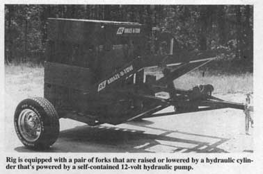 The rig is equipped with a pair of forks that are raised or lowered by a hydraulic cylinder that's powered by a self-contained 12-volt hydraulic pump. After you slip the forks under a load, you get out and operate a lever on the unit to raise the load. The forks tilt slightly forward as they're raised to secure the load. Two lock bars hold the lift mechanism safely in place.