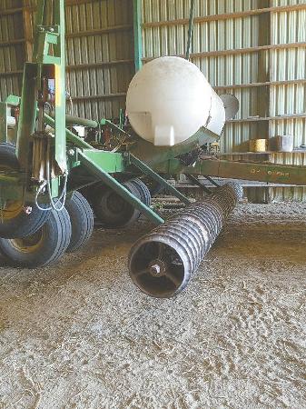 Andy Robson, Millbrook, Ontario, used the rollers off an old Deere culti-packer to build a low-cost packer that he mounted on front of his 6-row planter.
