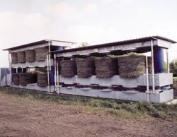 Bales are placed in a single layer across each of two floors, which have tunnels inside them with inset ducts. There's a third tunnel system at the top. A large fan powered by a diesel engine or 3-phase electric power is housed inside a metal shed at one end of the unit. The fan blows heated air through the bottom floor to three flexible poly tubes at the opposite end that carry the hot air up to the second floor, which is divided into an upper and lower tunnel. A single flexible tube delivers air to the tunnel system at the top.
