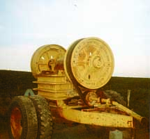 "My home-built rock crusher lets me get rid of rocks right in the field. I never have to handle them again," says Ivan Trantham, Millerton, Penn., who mounted rock quarry crushers on an old truck frame. He uses an 84 hp Ford 7600 tractor to pull the pto-driven rig across plowed fields before he plants. He simply drops rocks into an opening on one side of the machine and they're crushed into small pieces which fall onto the ground. The pieces range in size from 1/2 to 2 in. in dia. He bought the used rock crushing equipment from a company that normally sells to rock quarries. It consists of two large jaws made from solid cast steel mounted on an offset camshaft that's belt-driven by a big 3-ft. dia. pulley-flywheel. A second flywheel mounts on the other end of the shaft Trantham mounted the crushing components on a semi tractor frame cut down to 6 ft. long and fitted with dual wheels. In operation, one person drives the tractor while another person walks alongside the machine and drops rocks into the jaws. The pulverized rocks fall back onto the ground. "It'll crush rocks so big it takes two men to lift them," says Trantham. "The opening measures 24 in. wide by 32 in. long. It'll crush rocks up to 3 ft. in diameter as long as the rock has a pointed end that fits into the opening. The jaws will then snap the point off, making room for the rest of the rock. "I use it on about 30 acres a year. I set the machine to crush rocks to 1/2 in. dia. pieces although it can be set as wide as 2 in. The size can be changed by adjusting a big nut and bolt on back that's used to close the jaws together. One advantage of my rock crusher is that I don't have to spend any time hauling rocks. Another advantage is that the pulverized rocks release minerals and nutrients back into my fields. My neighbor uses the machine to fill holes and low places in his driveway with crushed rock. Surprisingly, it isn't very noisy -- if a soft rock gets thrown in it's hard to even hear it being crushed. "I bought the rock crushing components from an Indiana company and paid for the truck frame. The rock crusher components weigh 12,000 lbs. Total weight is 16,000 lbs. so my 84 hp, 2-WD tractor has all it can handle on plowed fields. I pulled the gears out of the truck axle to make it lighter and welded a steel plate over the opening where the gears had been, then filled it with oil to lubricate the axles."