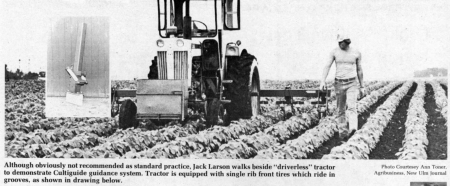 "Interest has been tremendous," says Minnesota farmer John Clair Larson, of Clements, who teamed up with his son Jack to invent and manufacture the new guidance system called the Cultiguide. "It not only steers the tractor but keeps the cultivator shovels the exact same distance from the row at all times for maximum weed control and minimum crop damage."
