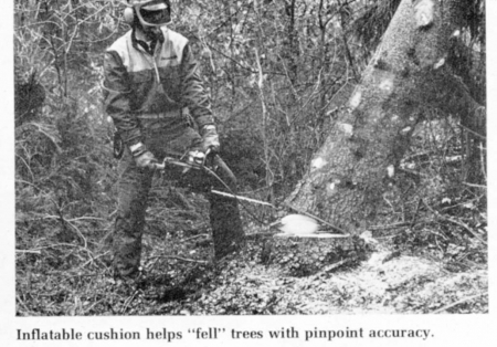 The latest new way to saw down trees and get them to fall exactly where you want them is an 18 oz. fabric cushion that slips into the saw cut and inflates with more than three tons of lift.