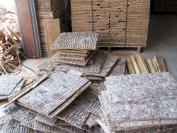 The bark is hand-peeled on site and carried to pallets, while the wood is harvested for the furniture and plywood industries. At the pallet, it's stacked flat to keep it clean, prevent damage and maintain quality. At a special kiln, it's dried at 150 degrees or higher to destroy insects, eggs, larvae and fungi without the use of chemicals. Moisture levels are lowered to between 8 and 12 percent. It's then cut to 18 and 24-in. lengths with varying widths. The Tulip Poplar siding is available in three grades: Interior (5/8 in. thick or less), Premium Standard (3/4 to 1 1/4 in. thick) and Super Premium (1 1/4 to 1 1/2 in. thick).