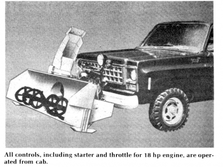 A new pickup-mounted snowblower lets you blow snow 50 ft. or more, thus eliminating the usual problems with high banks and lost space.