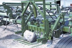 "The rock lifter mounts on the left side of the cultivator but could be placed anywhere. With this new tool, we're actually looking forward to finding rocks in the field. Best of all, Dick painted it Deere green to match the cultivator!"