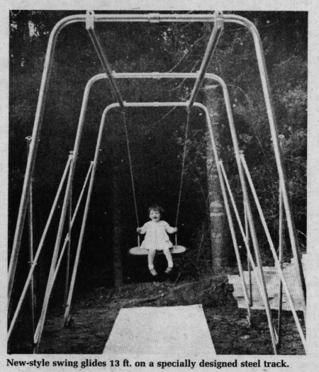 The swing is suspended from a pair of specially designed 4-wheel rollers fitted with nylon wheels and precision ball bearings. The rollers ride in a specially designed 14 ga. galvanized steel track protected from dust, dirt, sunlight and weather. Although Forbes says an adult could glide 120 ft. on a single push, production models are limited to a more practical 13 ft. The frame of the swing is an extra wide 6 ft. and it's 7 ft., 3 in. high. The main frame of the swing is made out of 1 3/8-in. galvanized tubular steel. "It's built strong enough so adults can use it too," Forbes notes.